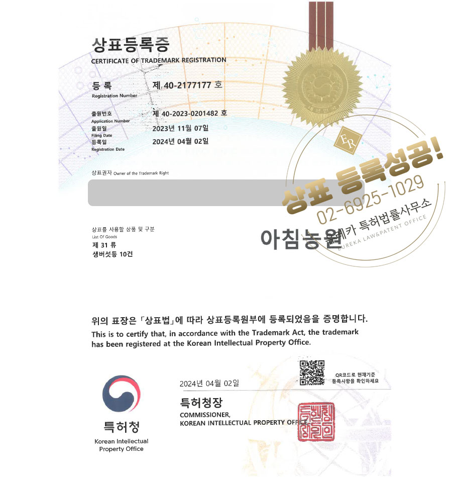 유레카 상표등록 성공! 버섯재배, 버섯농장 상표출원 “아침농원 / 아침농산” 표고버섯, 송로버섯, 새송이버섯, 식용버섯, 송화버섯, 건강식품 상표권등록