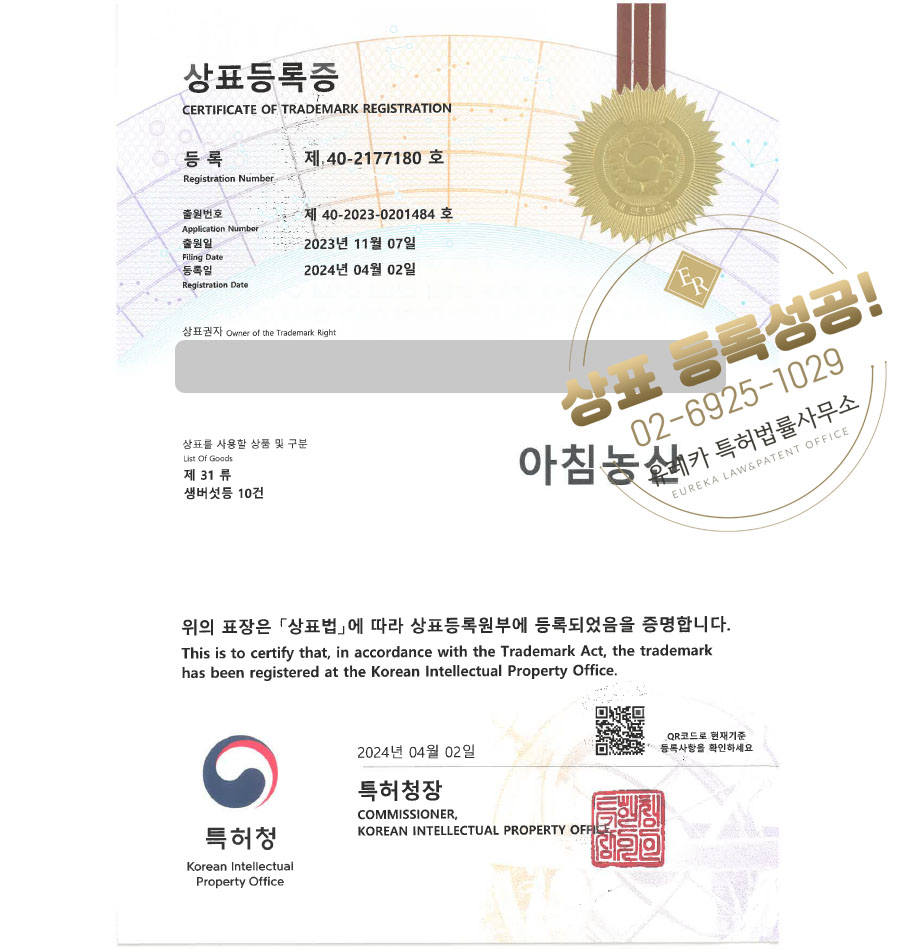 상표심사를 통과하여, 최종적으로 31류 상표등록에 성공하였습니다!