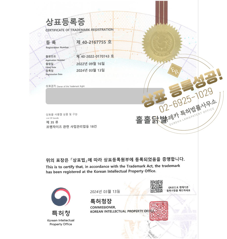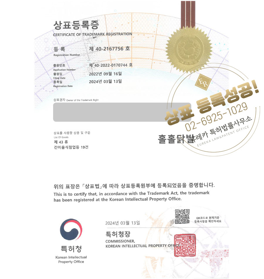 상표심사를 통과하여, 최종적으로 35류, 43류 상표등록에 성공하였습니다!