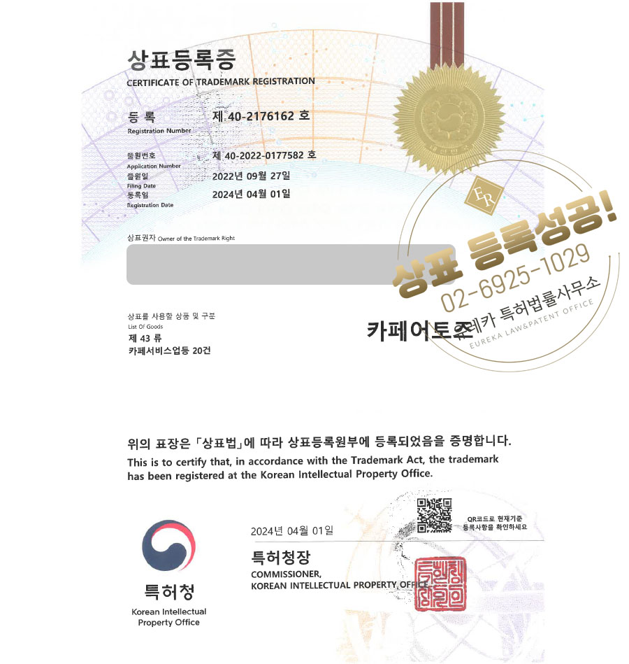 상표심사를 통과하여, 최종적으로 43류 상표등록에 성공하였습니다!