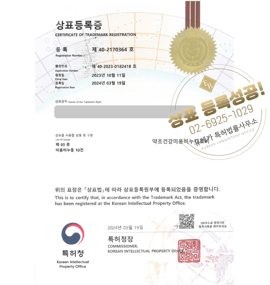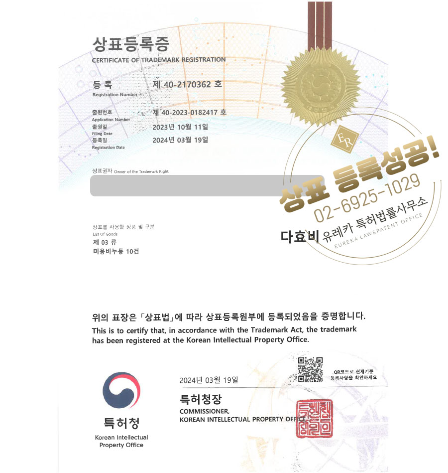 상표심사를 통과하여, 최종적으로 03류 상표등록에 성공하였습니다!