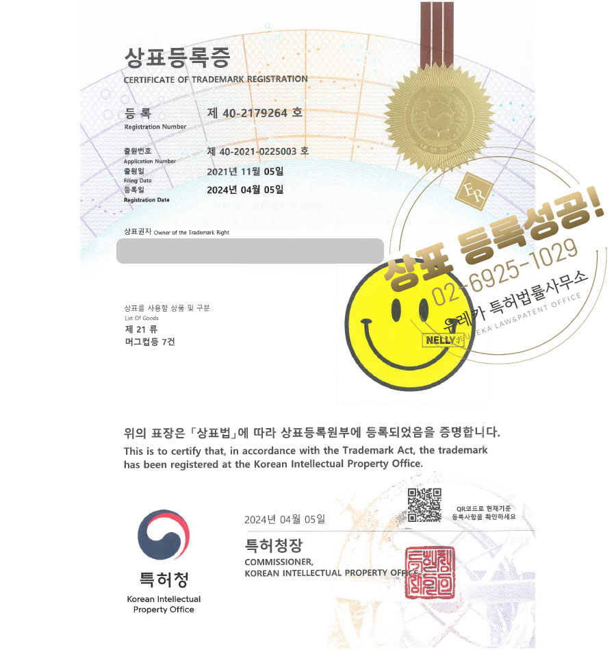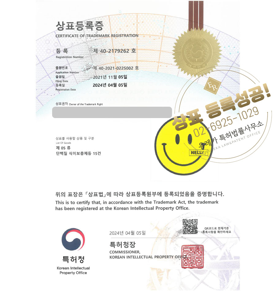상표심사를 통과하여, 최종적으로 05류, 21류, 35류 상표등록에 성공하였습니다!