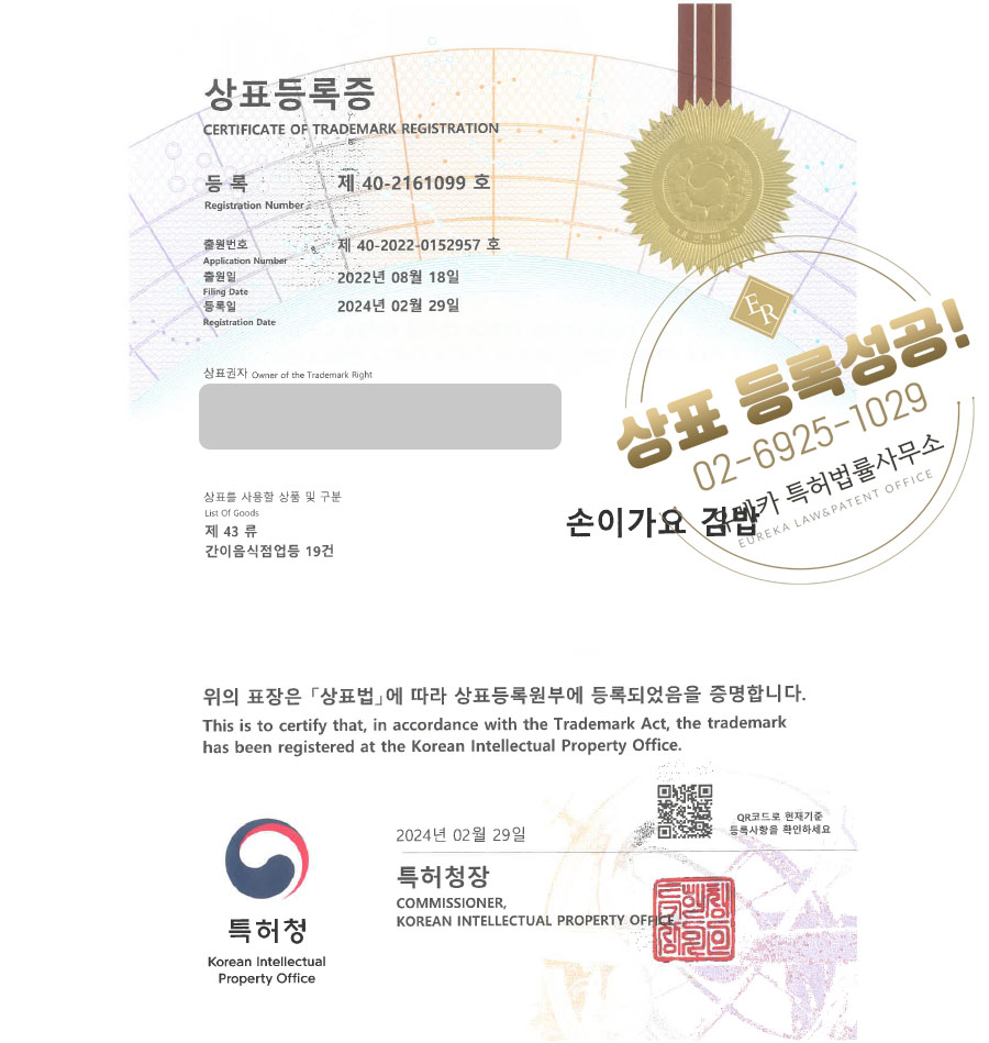 상표심사를 통과하여, 최종적으로 43류 상표등록에 성공하였습니다!