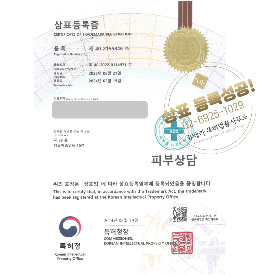 상표심사를 통과하여, 최종적으로 35류, 39류 상표등록에 성공하였습니다!