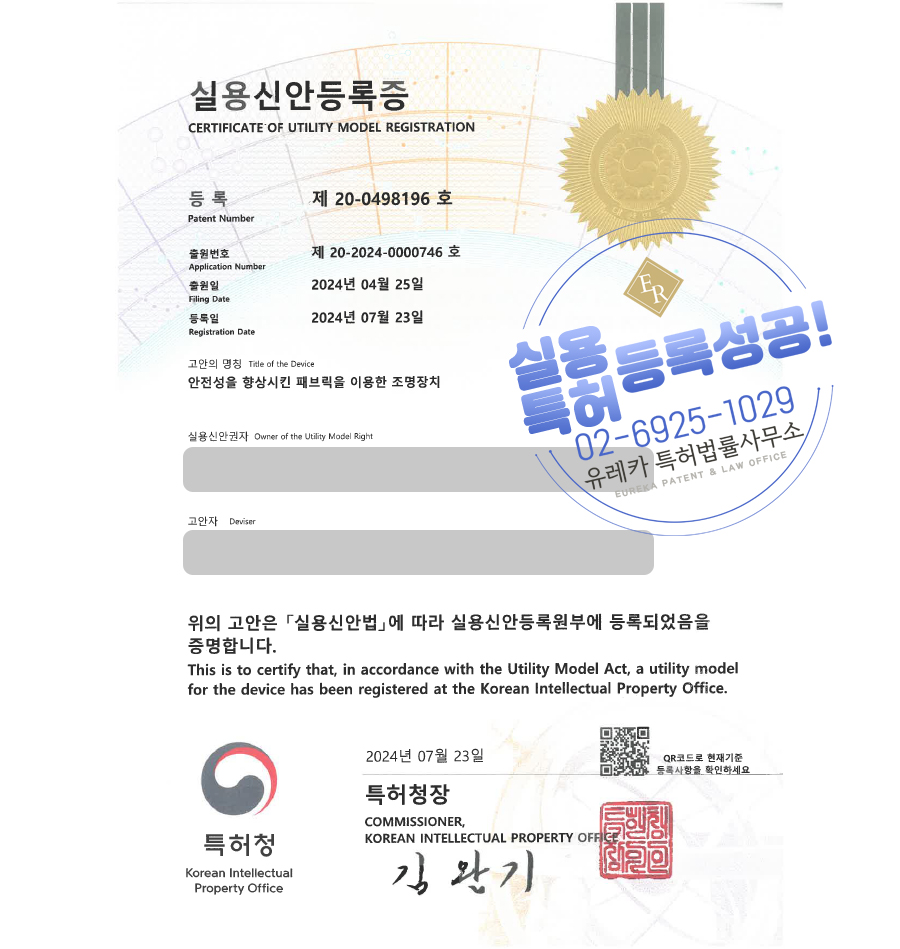 유레카특허법률사무소에서 실용신안 특허 등록 성공했습니다!