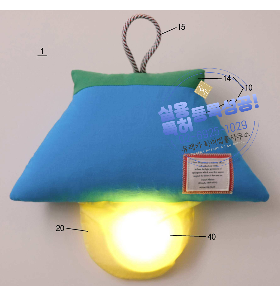 유아 및 어린 아이 등과 같이 사물 및 위험성에 대한 식별 및 인지도가 낮은 사용자에게도 안전한 조명을 제공할 수 있고, 물세탁이 가능하여 높은 청결도를 제공할 수 있는 효과가 있고, 본 고안은 데코부와 포켓부의 형상과 모양 및 색상을 다양하게 제작할 수 있으며, 사용자가 원하는 그림을 그리거나 채색이 가능하여 다양한 학습을 제공할 수 있는 효과가 있고 또한, 본 고안은 데코부의 테두리의 구조를 개선하여 충진공간에 충진되는 충진부재가 일부 영역에 뭉치는 것을 방지하고 전체적인 볼륨감을 향상시켜 미감을 향상시킨 효과가 있는 특징이 선행고안과 차별점으로 분석되었고,