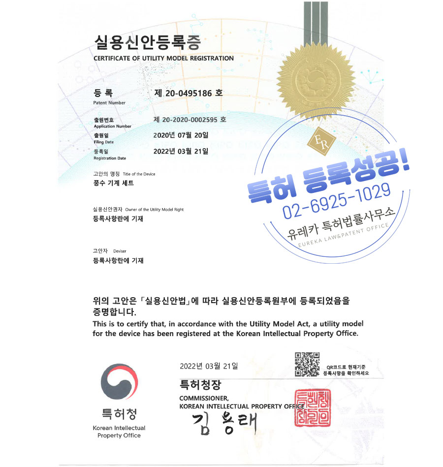 유레카특허법률사무소에서 실용신안 등록 성공했습니다!