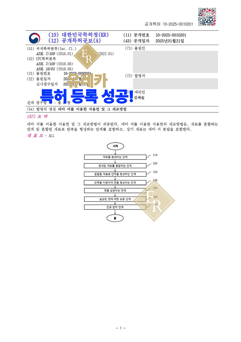 유레카 특허권 출원 사례 '기능성 식품 제조, 대마, 햄프씨 특산물, 대마씨 원료, 기능성 곡물면, 식물성 단백질 식품, 면 제조 공정, 건강식 식품 제조' 특허 등록 성공!