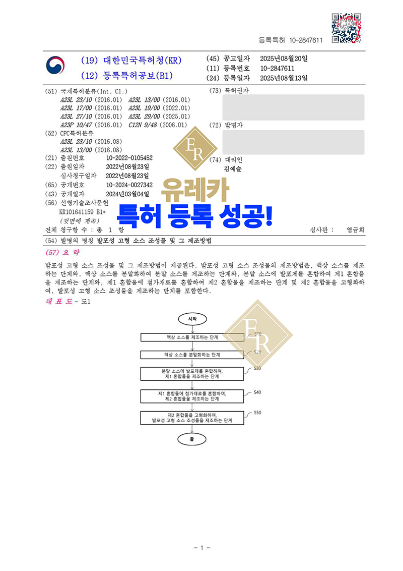 유레카 특허권 출원 사례 '즉석 조리 소스, 발포 식품 공정, 고형 조미료, 분말화 공정' 특허 등록 성공!