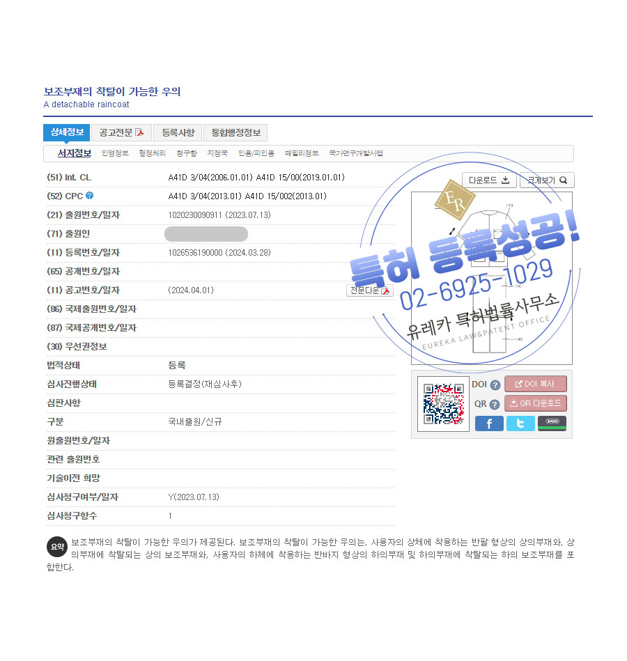 유레카 특허등록 성공사례! ☞ 기능성우비, 탈부착, 방수, 레인코트, 집중호우, 장마, 길이조절, 생활의류 특허출원 “보조부재의 착탈이 가능한 우의” 특허권등록