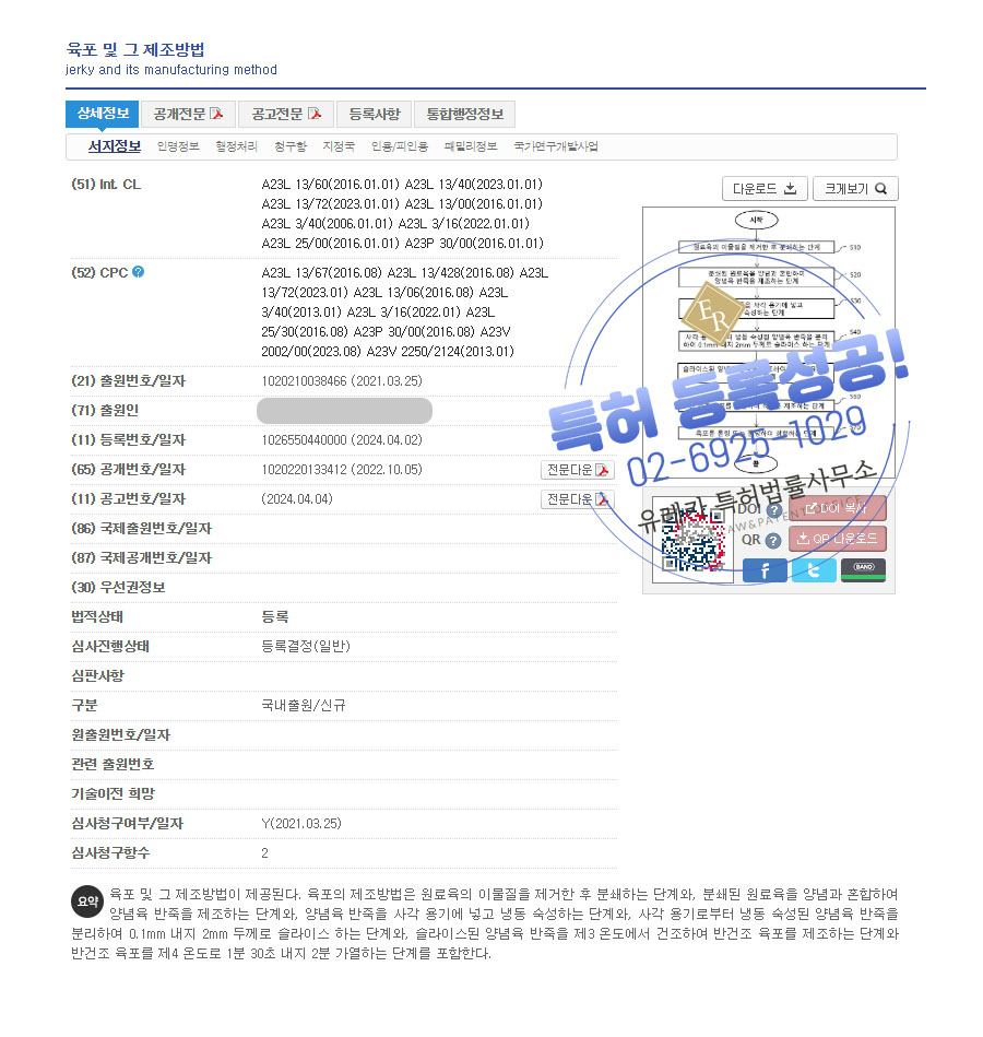 유레카 특허등록 성공사례! ☞ 훈제소고기, 음식, 영양간식, 레시피, 등산, 에너지보충식품 특허출원 “육포 및 그 제조방법” 특허권등록