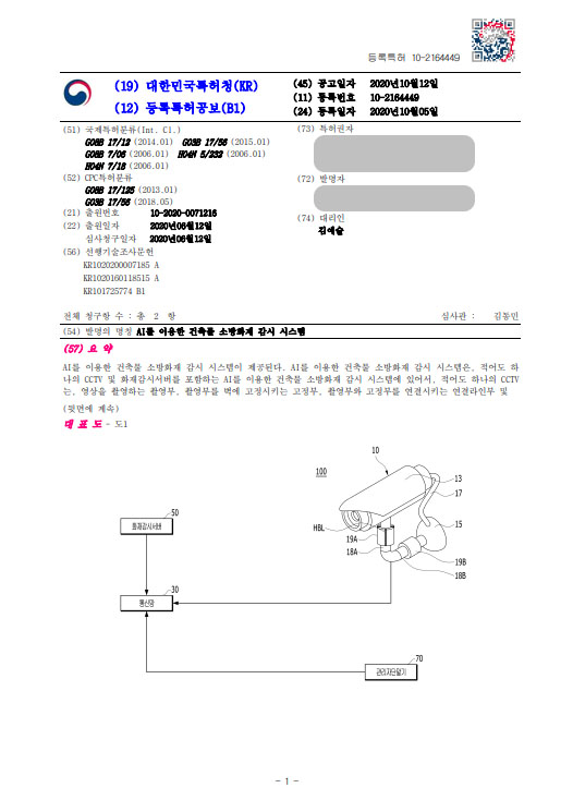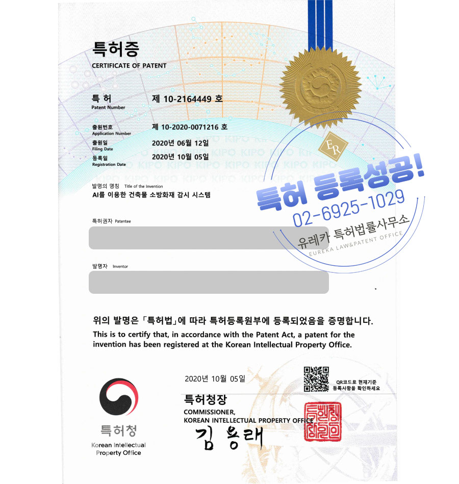 유레카 특허 등록 성공사례! ☞ 인공지능, 시스템, BM, CCTV, 보안, 딥러닝, 열감지센서, 화재감지, 인명구조, 소방 감리 특허 출원 “AI를 이용한 건축물 소방화재 감시 시스템” 특허권 등록