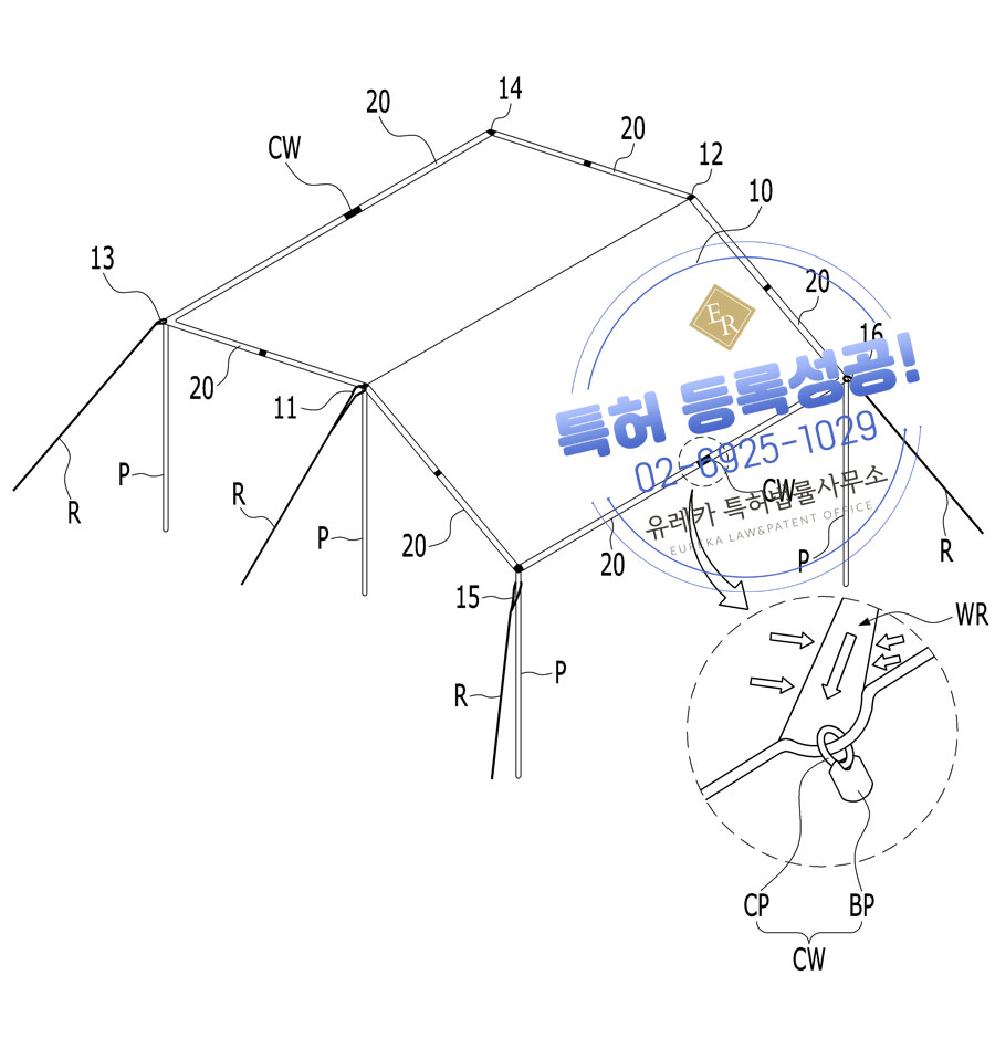 조절할 수 있으며 또한, 타프 체결추에는 조명이 설치되어 야간에 타프 체결추의 위치를 명확히 나타냄과 동시에 조명등의 역할을 할 수 있는 특징이 선행발명과 차별점으로 분석되었고,