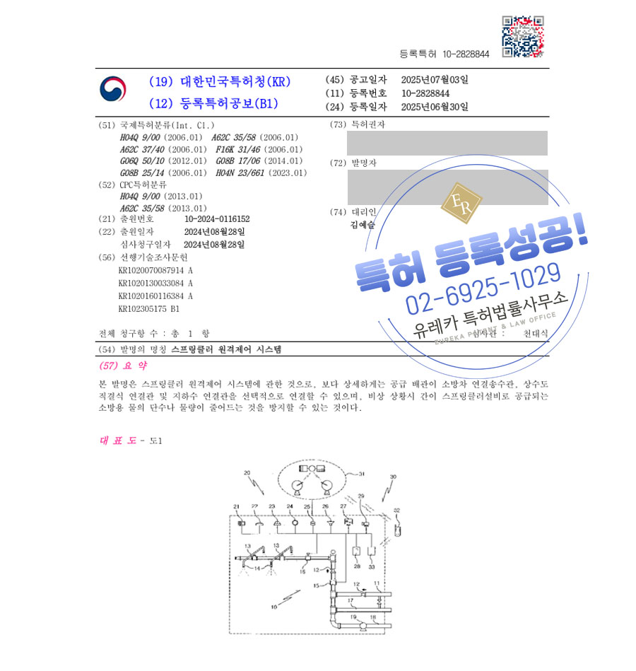 유레카 특허 등록 성공사례 I 소방, 스프링클러, 소화, 헤드, 건축, 주택, 배관, 화재, 진압, 시공, 설비, 보호, 감지 특허 출원 “스프링클러 원격제어 시스템” 특허권 등록