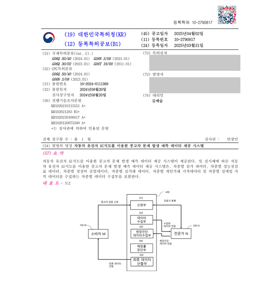 유레카 특허 등록 성공사례 I 자동차, 중고, 시뮬레이션, 성능, 분석, 스마트 특허 출원 “자동차 유전자 AI지도를 이용한 중고차 문제 발생 예측 데이터 제공 시스템” 특허권 등록