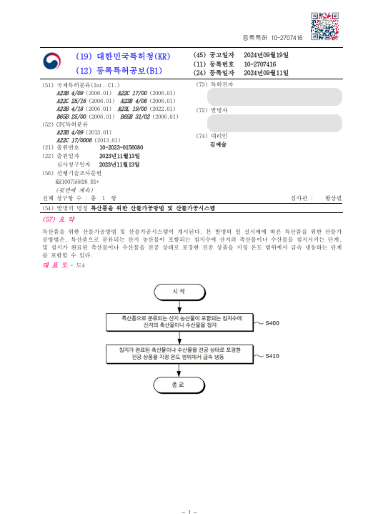 유레카 특허 등록 성공사례 II 가공 식품, 특산물, 상품화, 산지, 어류, 육류 가공 패키징 특허 출원 “특산품을 위한 산물가공방법 및 산물가공시스템” 특허권 등록