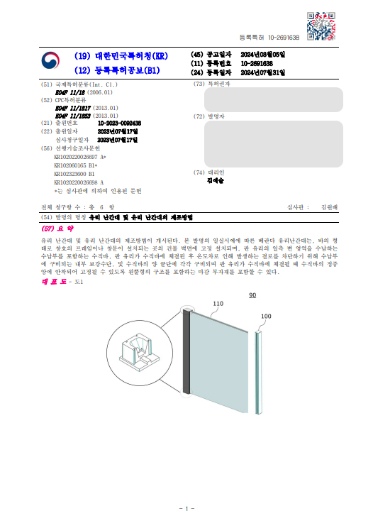 실내에서 외부의 뷰를 감상할 때 탁 트인 시야감을 줄 수 있고, 또 외부에서 실내를 바라볼 때 개방성을 제공할 수 있으며, 유리난간대의 설치와 유지보수가 수월할 수 있는 특징이 선행발명과 차별점으로 분석되었고,