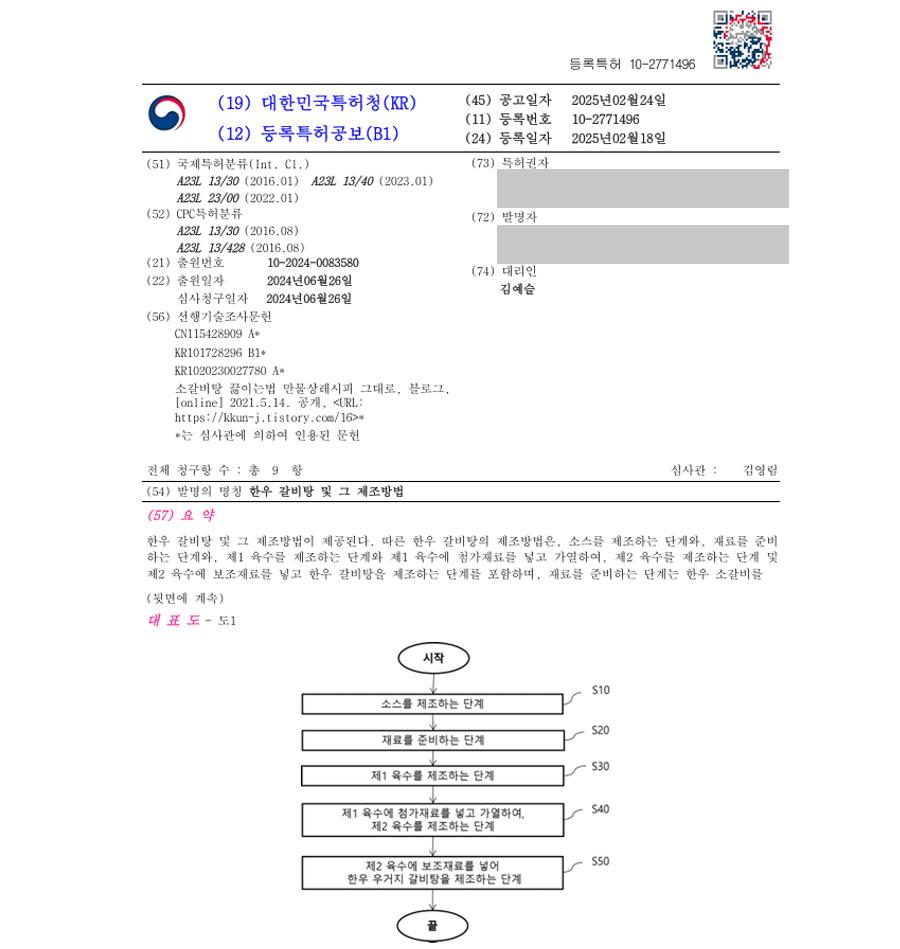 본 발명이 해결하고자 하는 과제는 잡내를 제거함과 동시에 균형있는 영양을 갖춘 한우 갈비탕 및 그 제조방법을 제공하는 것에 있는 특징이 선행발명과 차별점으로 분석되었고,