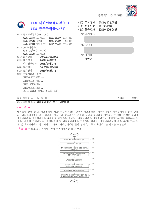 돼지미니족의 살과 돼지고기사태 및 돼지껍데기를 혼합하여 맛과 식감을 향상시킴과 동시에 누린내를 제거할 수 있게 되는 특징이 선행발명과 차별점으로 분석되었고,