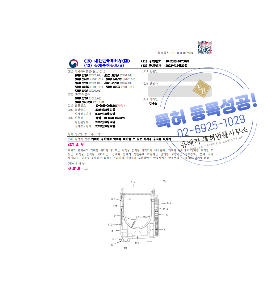 유레카 특허 등록 성공사례 II 분쇄기, 친환경, 위생, 음쓰 처리기, 발효 장치 특허 출원 “특허 명칭” 특허권 등록