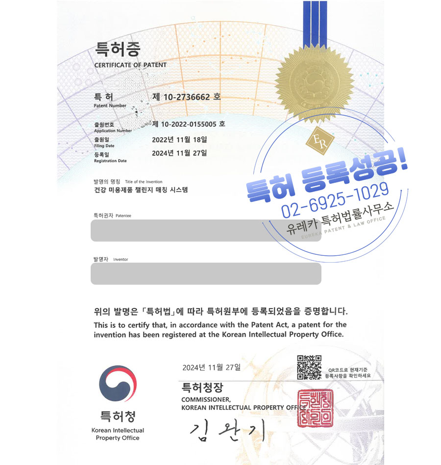 유레카특허법률사무소에서 특허등록 성공했습니다!