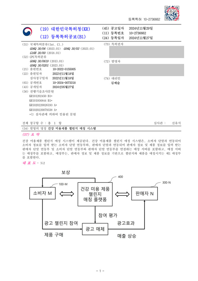 이와 같은 차별점을 기반으로 전략적인 특허출원을 진행하여 최종적으로 특허등록에