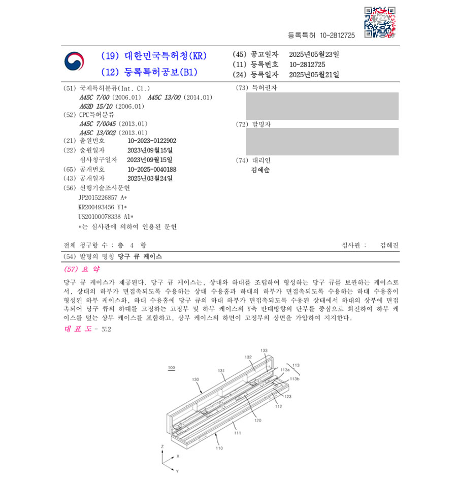 유레카 특허 등록 성공사례 II 스포츠, 당구, 케이스, 보관함, 보호, 보조, 커버, 프레임, 상자, 용기, 초크, 게임, 카드, 폰, 화장품 특허 출원 “당구 큐 케이스” 특허권 등록
