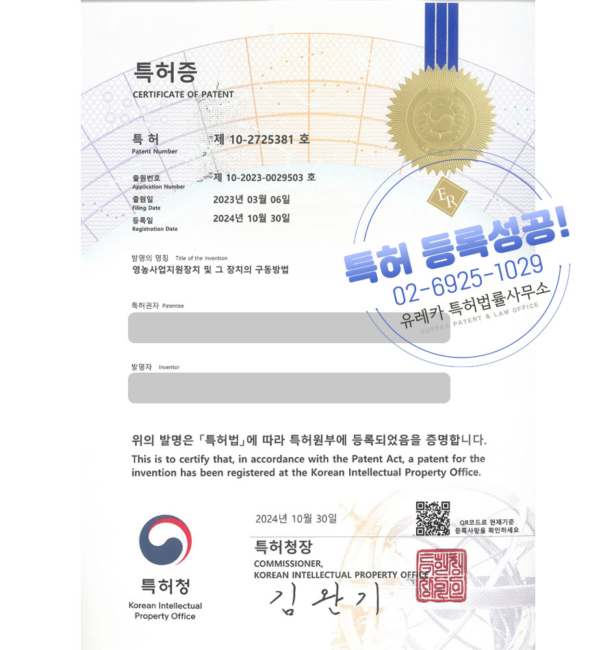 유레카특허법률사무소에서 특허등록 성공했습니다!