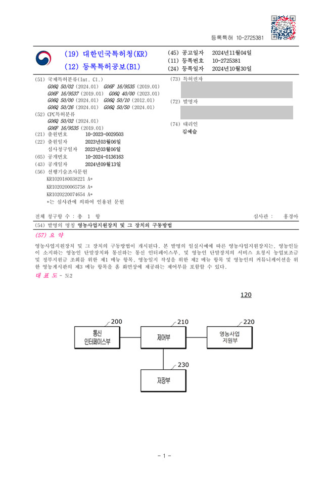 유레카 특허 등록 성공사례 II 어플, 앱, 애플리케이션, 플랫폼, 방법 특허 출원 “영농사업지원장치 및 그 장치의 구동방법” 특허권 등록