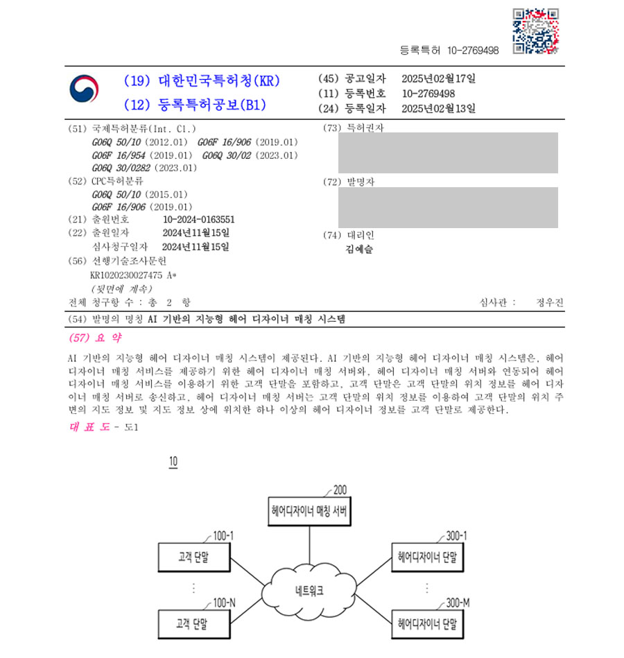 유레카 특허 등록 성공사례 II 인공지능, 알고리즘, 챗봇, 딥러닝, 스마트, 최적화, 데이터 특허 출원 “AI 기반의 지능형 헤어 디자이너 매칭 시스템” 특허권 등록