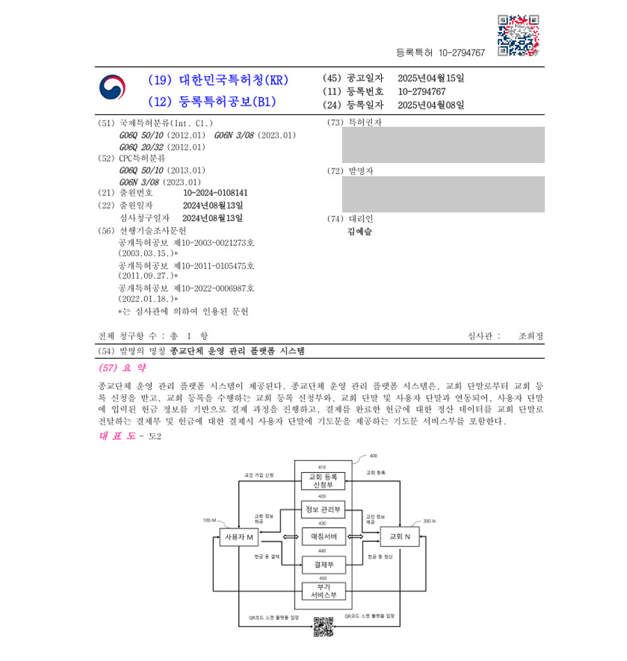 유레카 특허 등록 성공사례 II 종교, 교회, 기부, 단체, 모금, 정산, 플랫폼, 정보, 관리, 단말기, 앱, 애플리케이션 특허 출원 “종교단체 운영 관리 플랫폼 시스템” 특허권 등록