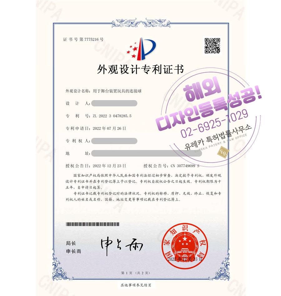 디자인 심사를 통과하여, 최종적으로 중국 등 디자인등록에 성공하였습니다!