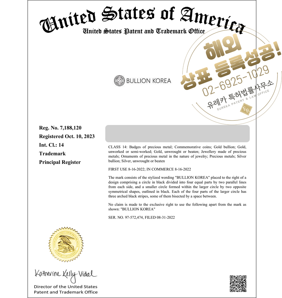 유레카 해외등록 성공! ▶ 미국 상표 출원 “BULLION KOREA” 유럽, 영국, 독일, 프랑스, 멕시코, 호주, 캐나다, 브라질, 이탈리아, 해외, 국제, 마드리드 절차, 방법, 심사, 상표권 특허 등록