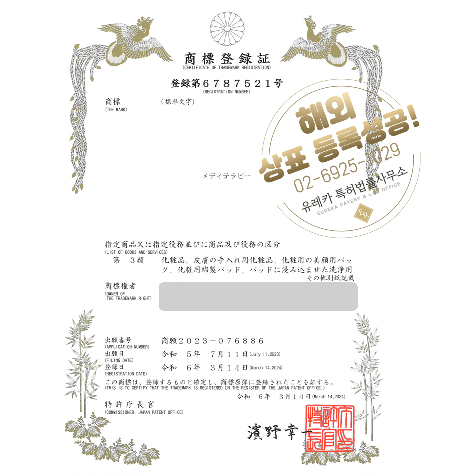 상표심사를 통과하여, 최종적으로 일본 등 상표등록에 성공하였습니다!