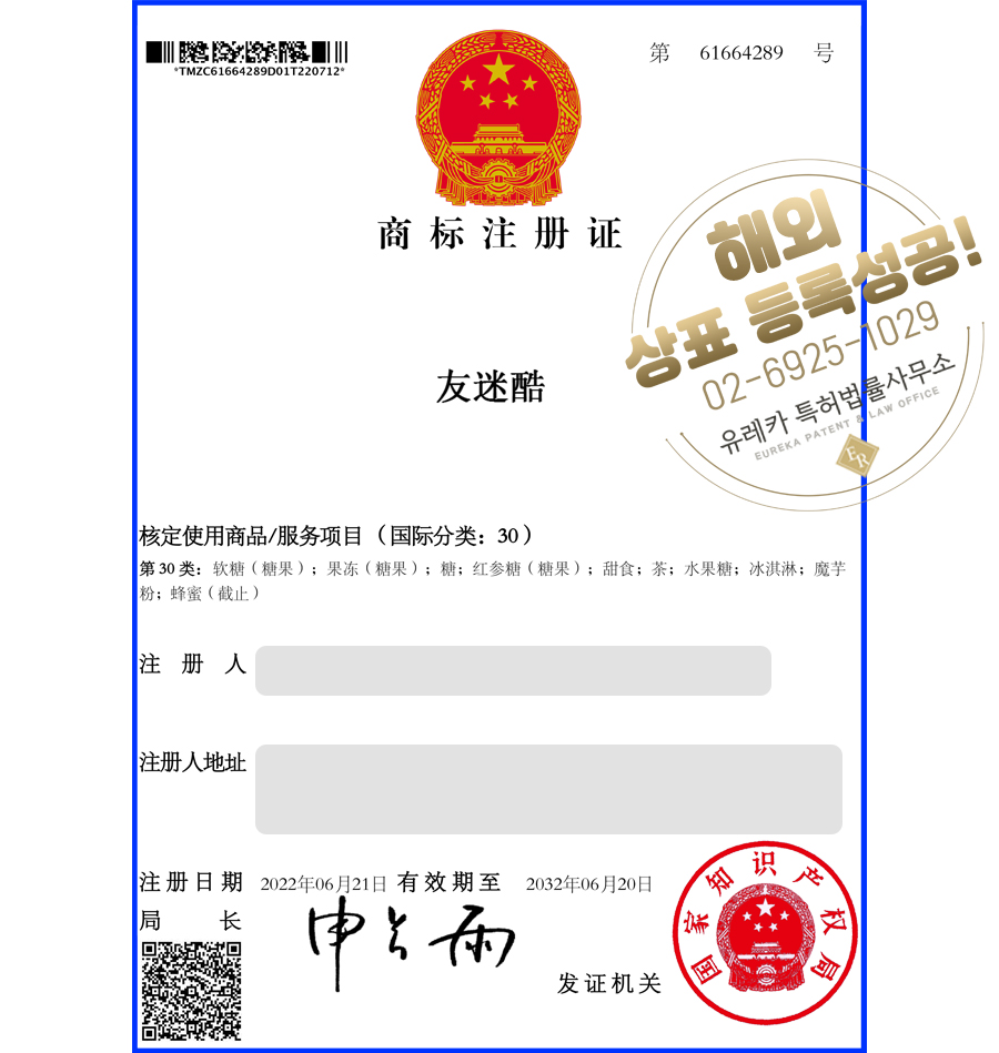 상표심사를 통과하여, 최종적으로 중국 등 상표등록에 성공하였습니다!