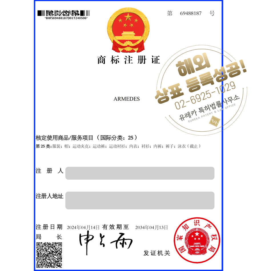 상표심사를 통과하여, 최종적으로 중국 등 상표등록에 성공하였습니다!