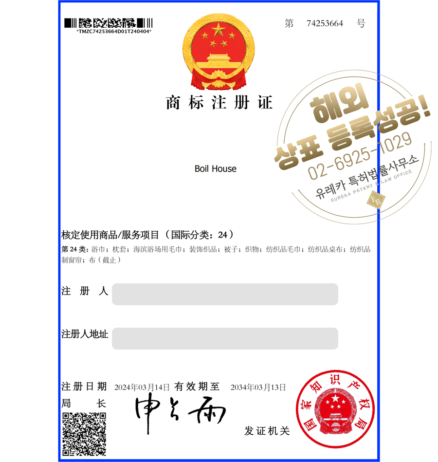 상표심사를 통과하여, 최종적으로 중국 등 상표등록에 성공하였습니다!