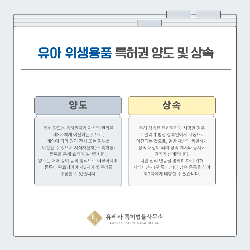 유아용 위생용품 관련 특허 역시 다른 재산과 동일하게 상속 대상이 되며, 별도의 계약 없이도 권리가 이전됩니다.