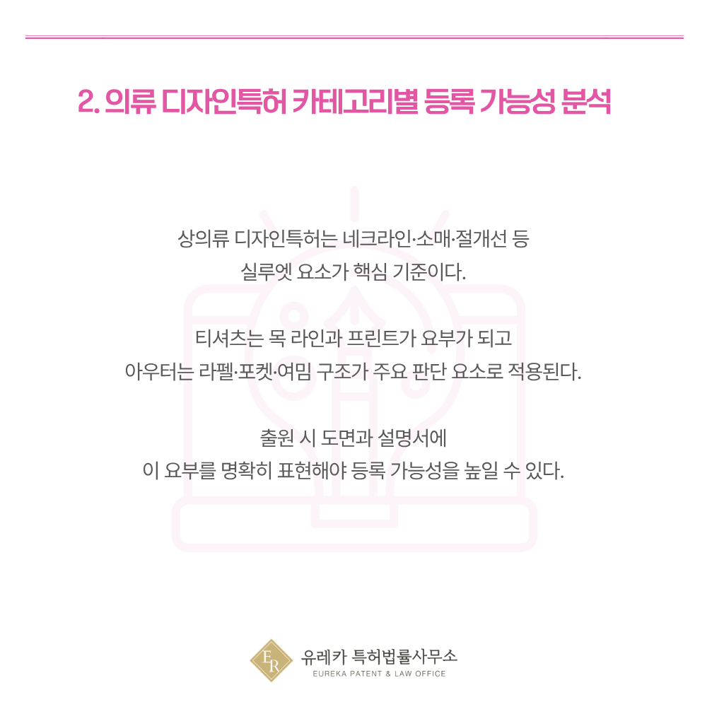 의류 디자인특허에서 상의류는 실루엣과 구조 요소가 핵심 기준입니다.