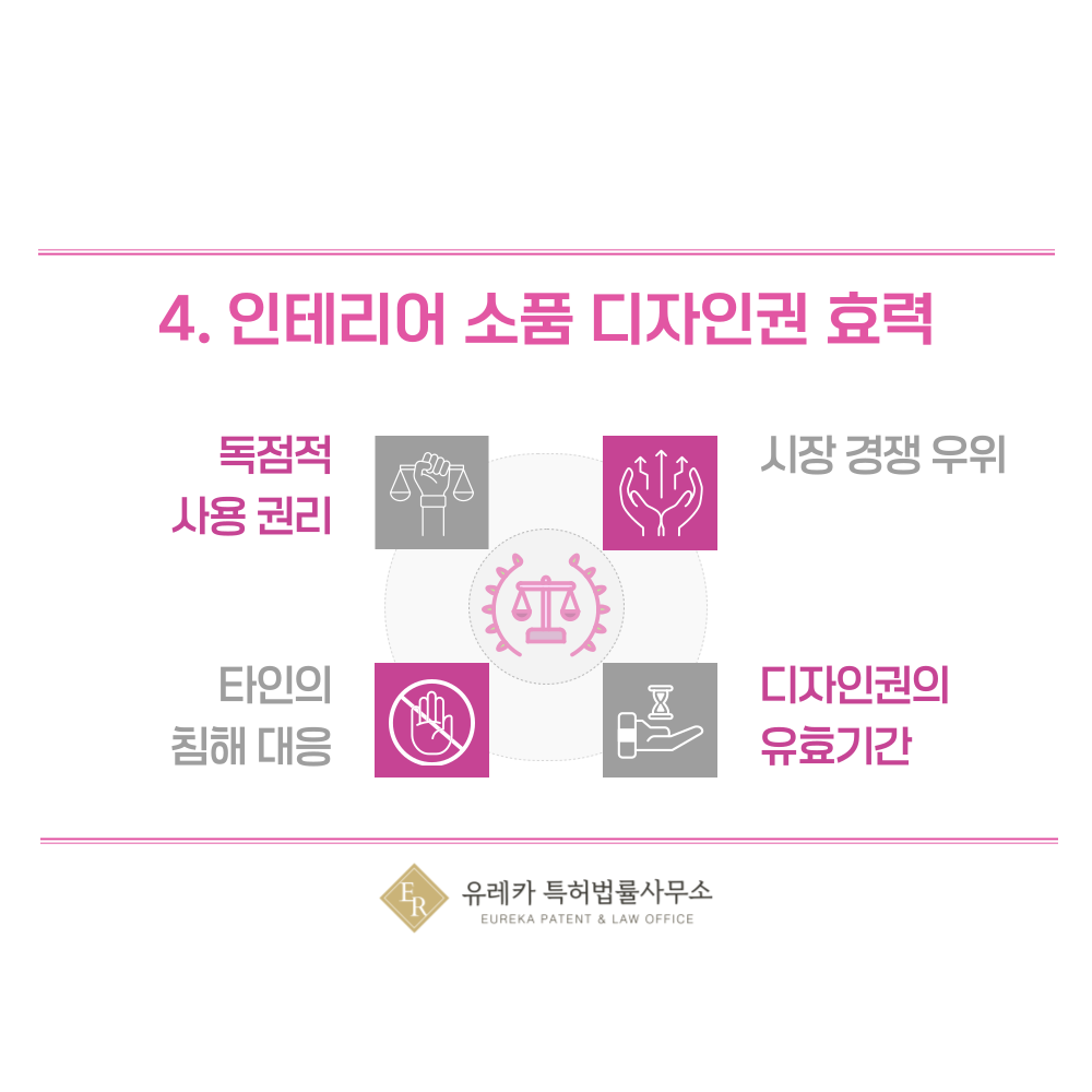 디자인권을 통해 인테리어 소품의 독창성과 차별화된 디자인을 보호할 수 있으며, 이를 통해 시장 내 경쟁에서 우위를 점할 수 있습니다.