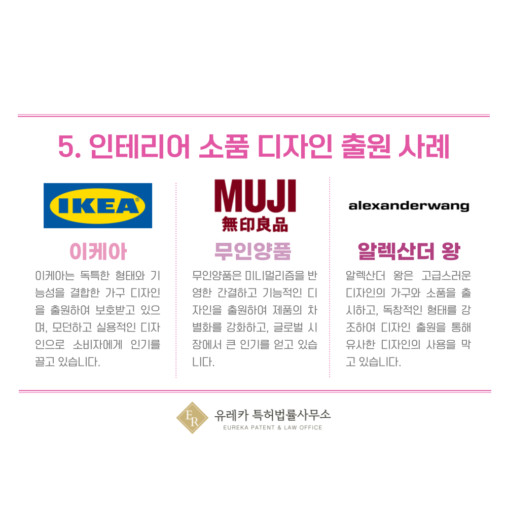 예를 들어, 이케아는 특별한 형태와 기능성을 결합한 가구를 디자인하여 출원하고, 이를 통해 다른 업체들이 비슷한 디자인을 사용할 수 없도록 보호받고 있습니다.