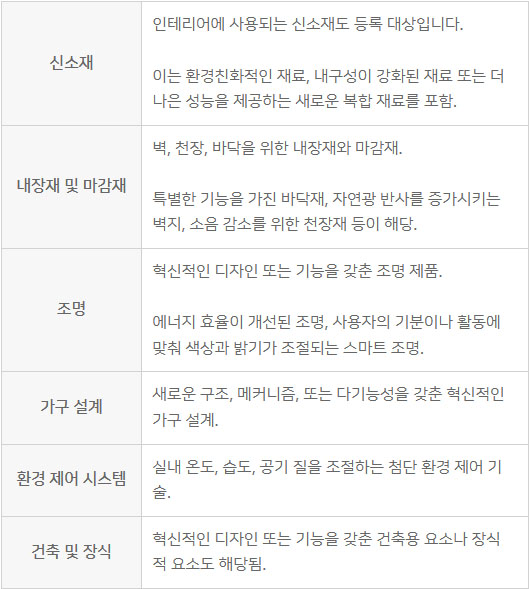 인테리어 업계에서 기존에 알려진 자재나 디자인과 구분되어야 하며, 완전히 새로운 아이디어나 특성을 지녀야 합니다.