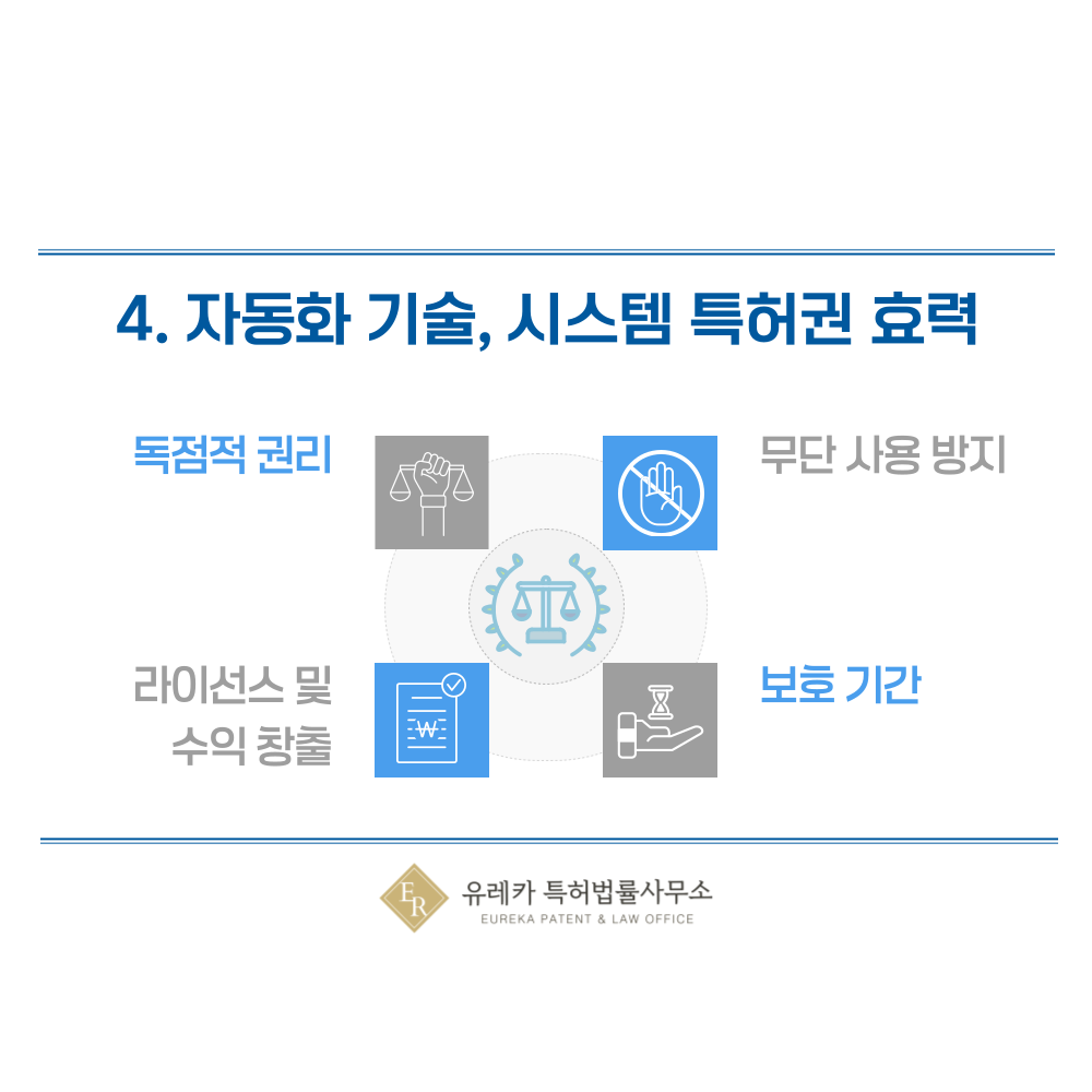 특허권을 보유하면 자동화 기술과 시스템을 독점적으로 사용할 수 있는 권리를 갖게 됩니다. 이를 통해 다른 사람이 같은 기술을 사용할 수 없도록 보호할 수 있습니다.