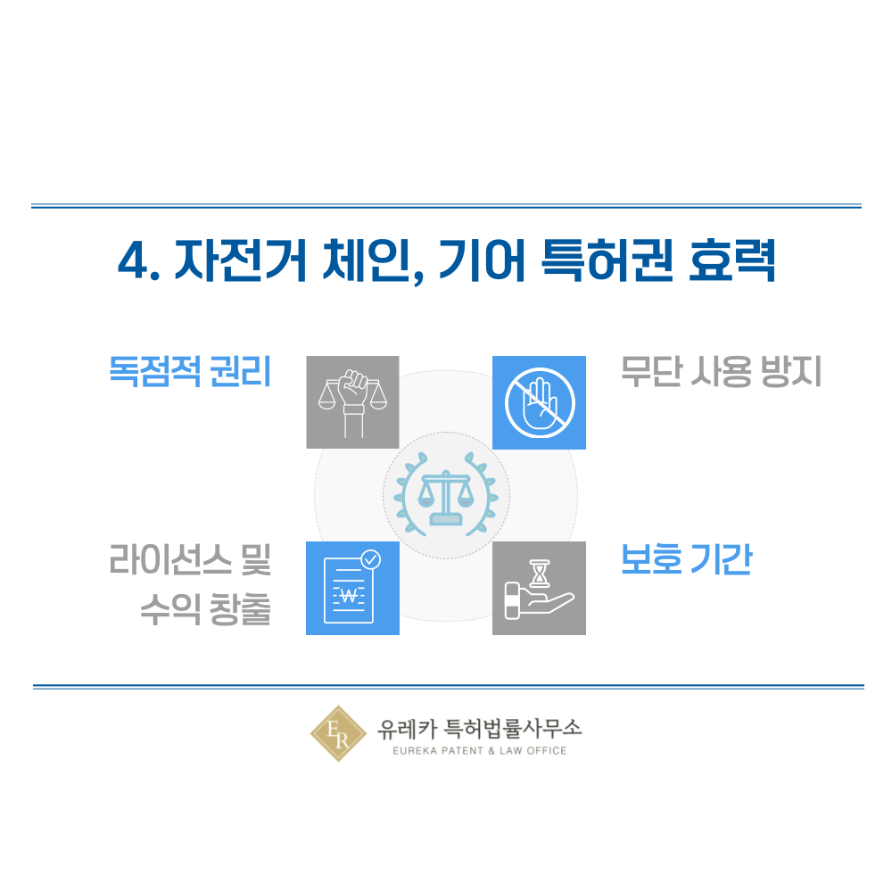 자전거 체인이나 기어에 대한 특허가 등록되면, 그 기술을 일정 기간 동안 내가 독점적으로 만들고 판매하고 사용할 수 있어요.