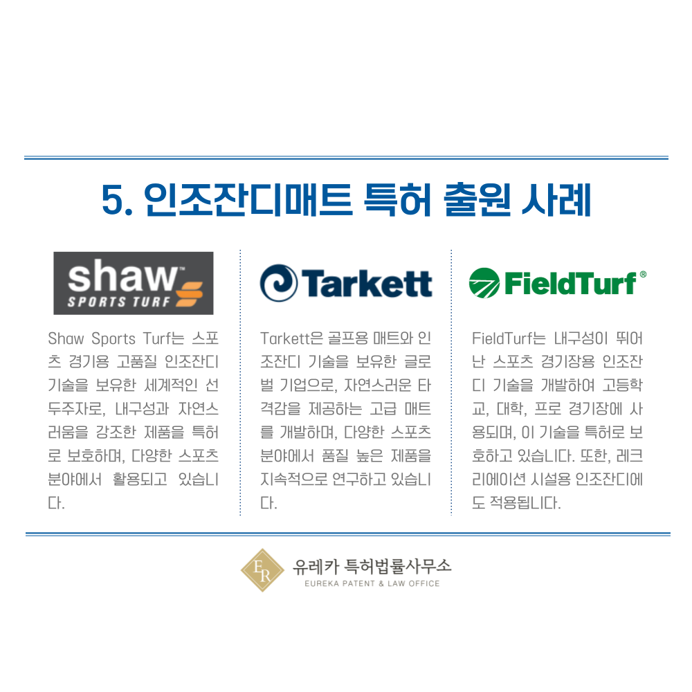이 업체는 스포츠 경기용 인조잔디 제품을 특허로 보호하고 있으며, 내구성과 자연스러운 느낌을 강조하는 기술로 유명합니다.