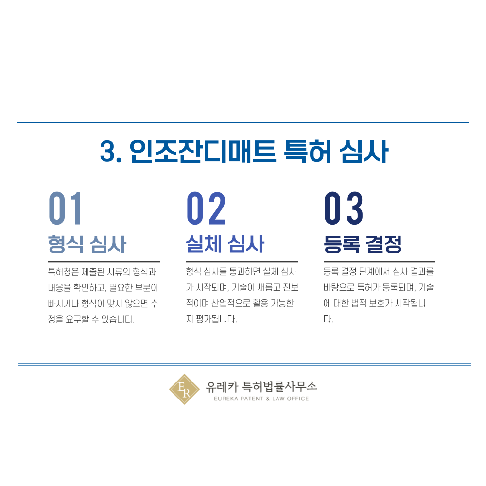이 단계에서는 출원한 기술이 신규성, 진보성, 산업적 이용 가능성 등의 특허 요건을 충족하는지를 평가합니다.