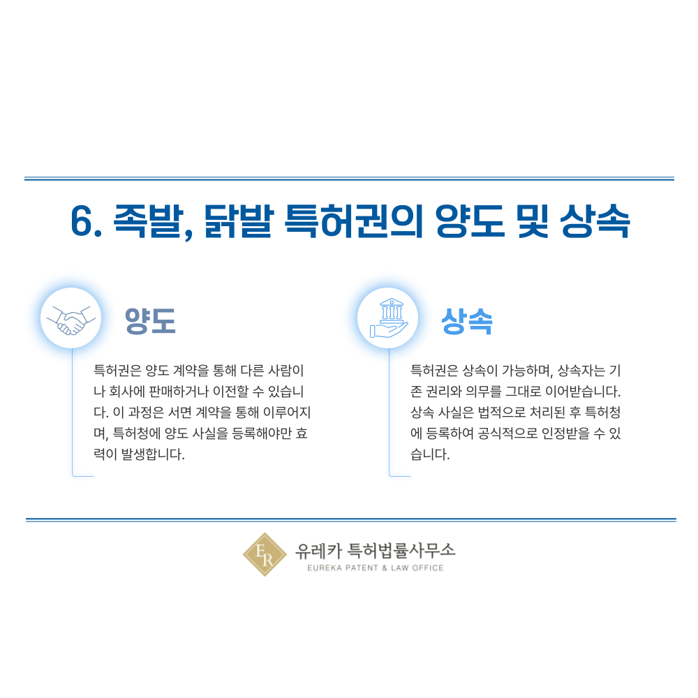 족발, 닭발 관련 특허권은 계약을 통해 다른 사람이나 회사에 넘길 수 있습니다. 양도 계약을 체결한 후 특허청에 등록하면 권리가 공식적으로 이전됩니다.
