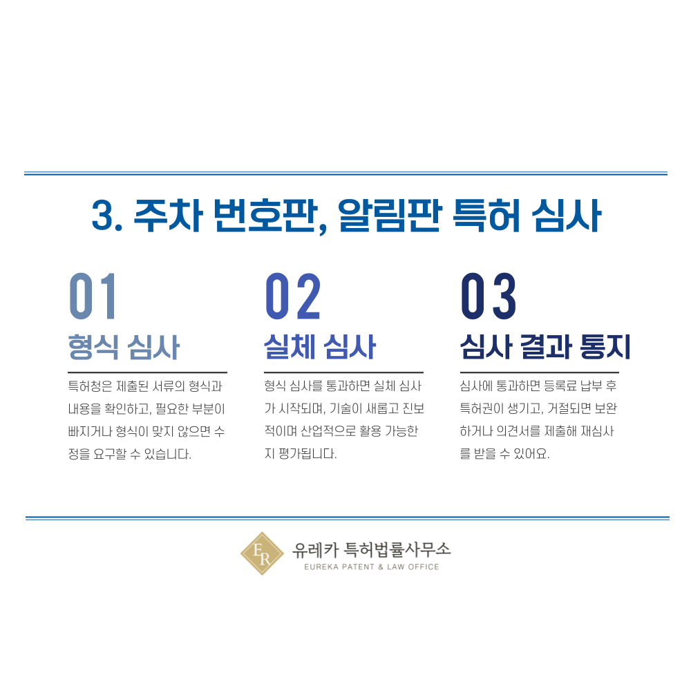 주차 번호판, 알림판 기술이 신규성, 진보성, 산업적 이용 가능성을 갖추었는지 꼼꼼히 심사해요.