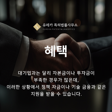 이외에도 중소기업특허등록 시 다양한 혜택이 있으니, 이에 대해 자세히 알아보고 싶으신 분들은 당소로 문의하여 주시기 바랍니다.