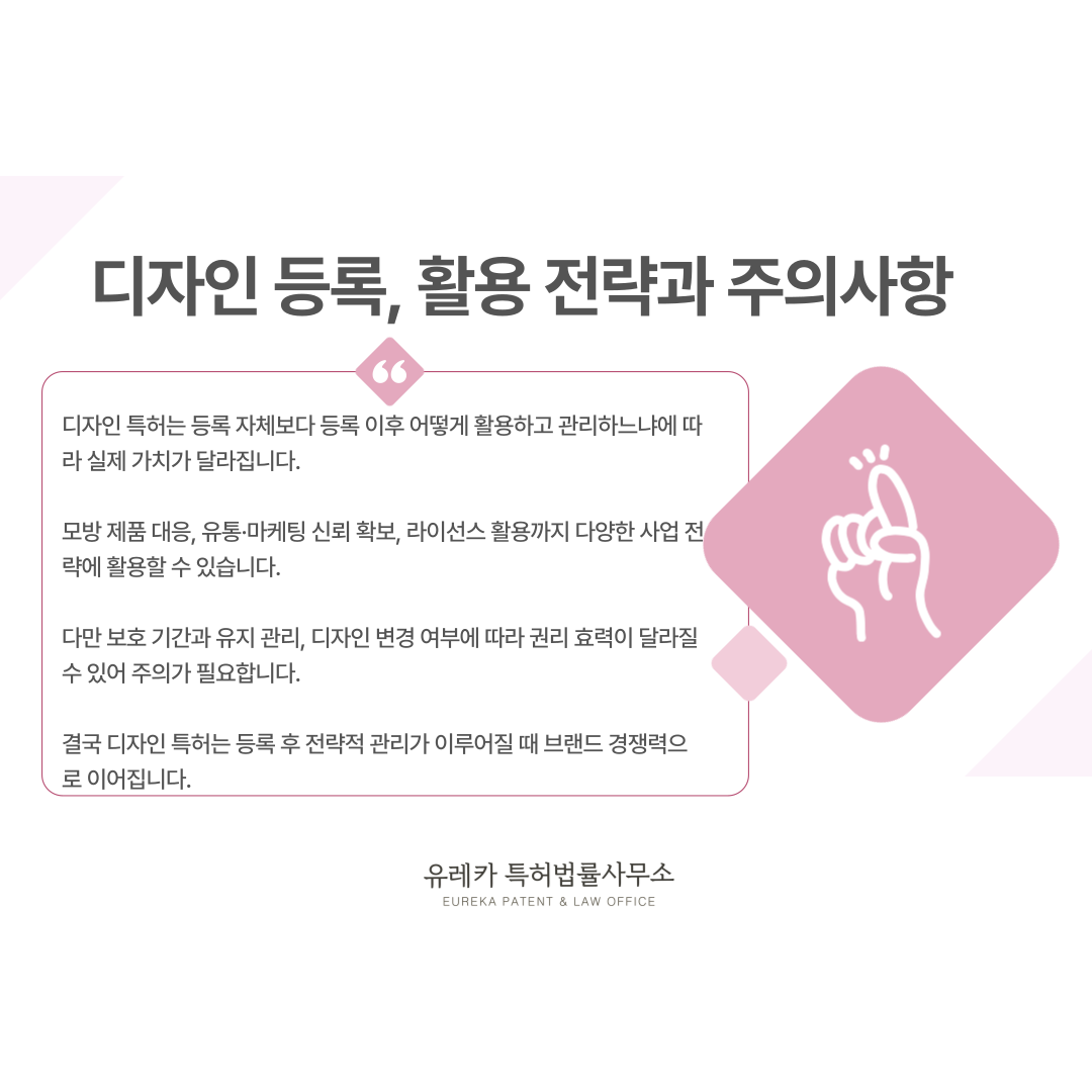 등록 이후 어떻게 활용하느냐에 따라 디자인권의 실제 가치가 크게 달라집니다.